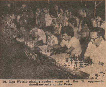 In 1976, chess was included in the month-long Pesta Pulau Pinang programme. The Association held an exhibition of chess photographs by its president, Mr Fang Ewe Churh, at the Pesta grounds in Macallum Street Ghaut. Dr Max Wotulo, an International Master from Indonesia who was at that time lecturing at the Universiti Kebangsaan, was invited to give a lecture and a simultaneous display. A Pesta open tournament was also organised towards the end of the Pesta month. Here are reports from the New Straits Times and the National Echo.